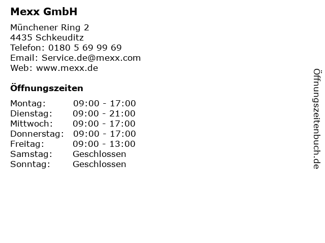 | Öffnungszeiten Mexx GmbH in Schkeuditz anzeigen | |