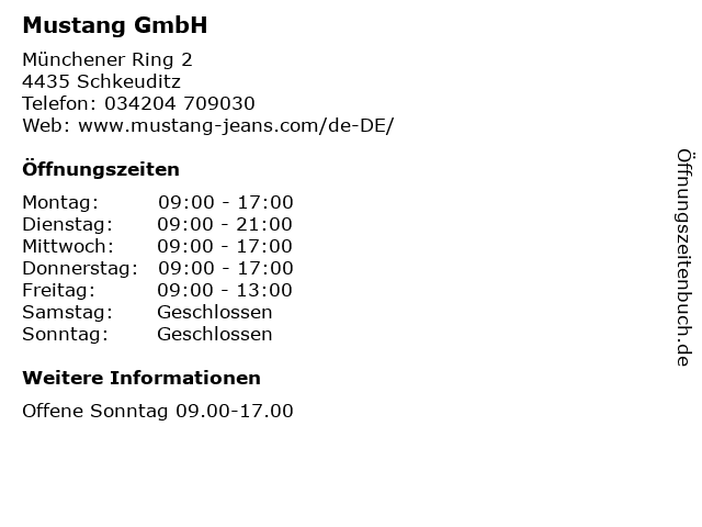 | Öffnungszeiten Mustang GmbH in Schkeuditz anzeigen | |