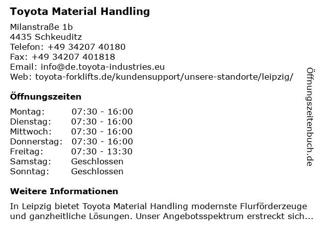 | Öffnungszeiten Toyota Material Handling in Schkeuditz anzeigen | |
