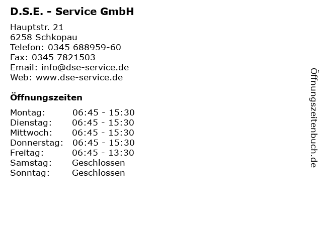 | Öffnungszeiten D.S.E. - Service GmbH in Schkopau anzeigen | |