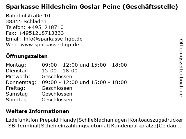 4 Sparkasse Hildesheim Goslar Peine (Geldautomat) (Entfernung: 0,00 km) Bahnhofstraße 10, 38315 Schladen 6 |