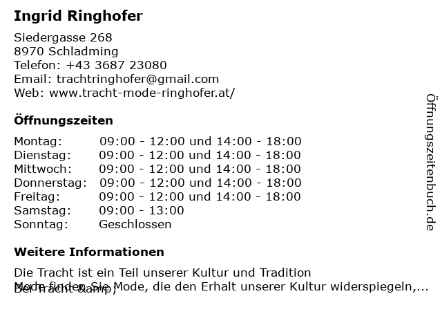| Öffnungszeiten Ingrid Ringhofer in Schladming anzeigen | |