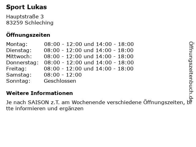 | Öffnungszeiten Sport Lukas in Schleching anzeigen | |