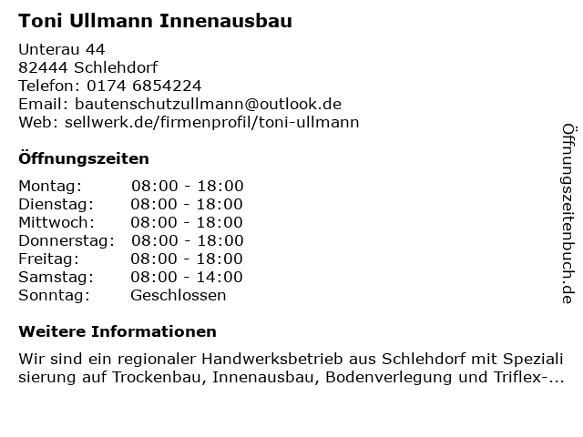 | Öffnungszeiten Toni Ullmann Innenausbau in Schlehdorf anzeigen | |