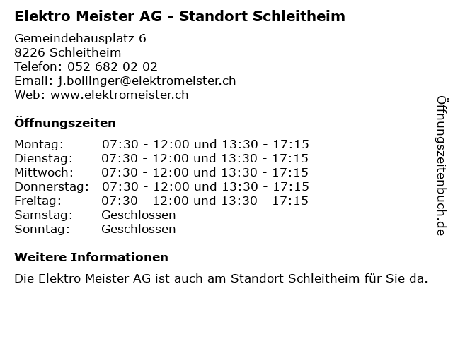 Branchen & Suchbegriffe zu Elektro Meister AG - Standort Schleitheim:beleuchtungsgeschäft, elektro, gerätereparaturdienst, geschäft für geräte, meister, schleitheim, standort, unternehmen für solarenergie |