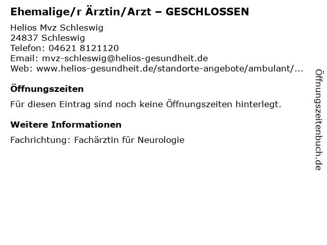 1 Dr. med. Ursula Gast - Ärztin für Psychotherapeutische Medizin (Entfernung: 7,16 km) Heidelücker Weg 4, 24875 Mittelangeln 2 Dr.med. Karl-Heinz Brückner Arzt für Innere Medizin (Entfernung: 9,64 km) Schleswiger Str. 31, 24941 Flensburg 3 Elisabeth Dethlefsen Ärztin, Allgemeine Chirurgie, Neurochirurgie (Entfernung: 9,97 km) Waitzstr. 1, 24937 Flensburg 4 Siglinde Theede Ärztin für Innere Medizin und Arbeitsmedizin (Entfernung: 10,38 km) Nikolaiallee 14, 24937 Flensburg 6 |