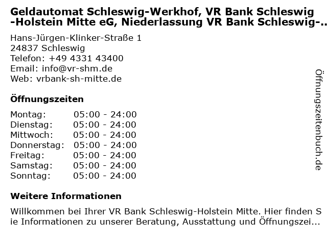 Branchen & Suchbegriffe zu Geldautomat Schleswig-Werkhof, VR Bank Schleswig-Holstein Mitte eG, Niederlassung VR Bank Schleswig-Mittelholstein:bank, eg, geldautomat, holstein, mitte, mittelholstein, niederlassung, vr, werkhof |