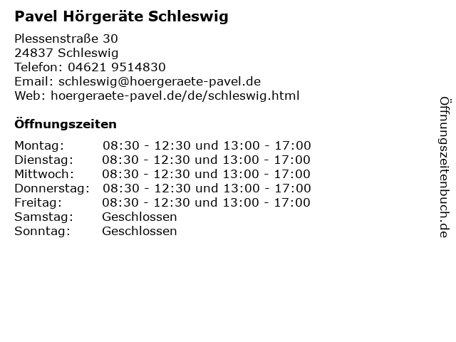 | Öffnungszeiten Pavel Hörgeräte Schleswig in Schleswig anzeigen | |