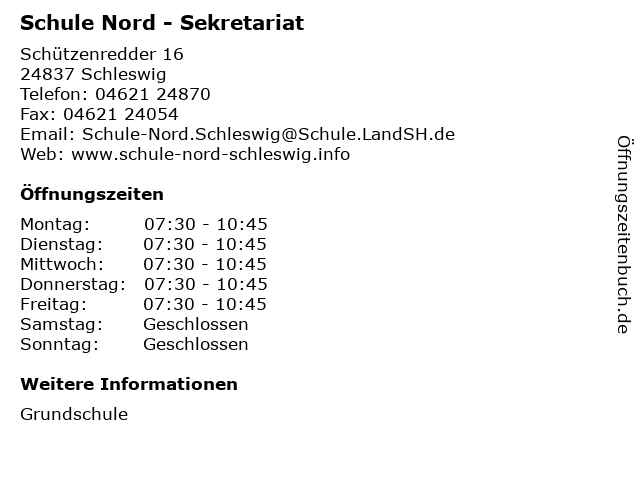 | Öffnungszeiten Schule Nord - Sekretariat in Schleswig anzeigen | |