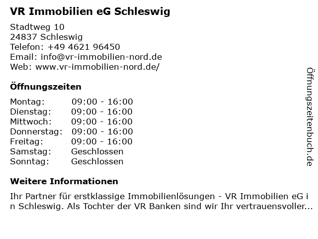 | Öffnungszeiten VR Immobilien eG Schleswig in Schleswig anzeigen | |