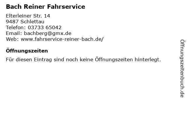| Öffnungszeiten Bach Reiner Fahrservice in Schlettau anzeigen | |