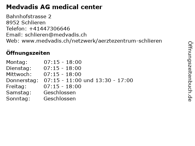 | Öffnungszeiten Medvadis AG medical center in Schlieren anzeigen | |