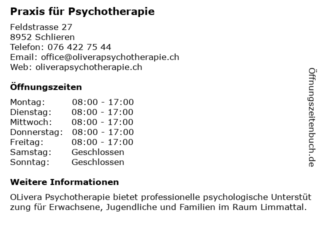| Öffnungszeiten Praxis für Psychotherapie in Schlieren anzeigen | |