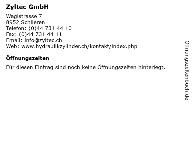 | Öffnungszeiten Zyltec GmbH in Schlieren anzeigen | |