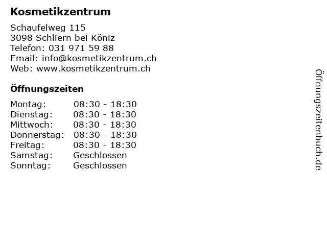 | Öffnungszeiten Kosmetikzentrum in Schliern bei Köniz anzeigen | |
