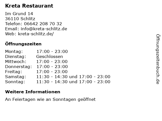 | Öffnungszeiten Kreta Restaurant in Schlitz anzeigen | |