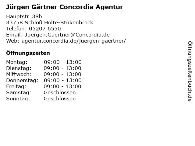 1 Concordia Versicherungsbüro Jürgen Gärtner (Entfernung: 3,29 km) Holter Straße 252, 33758 Schloß Holte-Stukenbrock 2 Tanja Gärtner-Hansing Lottorieannahme & Reisebüro (Entfernung: 5,49 km) Hauptstraße 2, 33813 Oerlinghausen 5 Gärtner Nicole Winkelmann & Steinmeier-Held Rechtsanwaltsk (Entfernung: 14,19 km) Regerstr. 7, 33604 Bielefeld 6 |