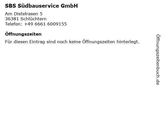 | Öffnungszeiten SBS Südbauservice GmbH in Schlüchtern anzeigen | |