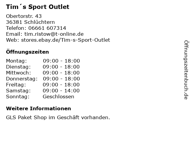 | Öffnungszeiten Tim´s Sport Outlet in Schlüchtern anzeigen | |