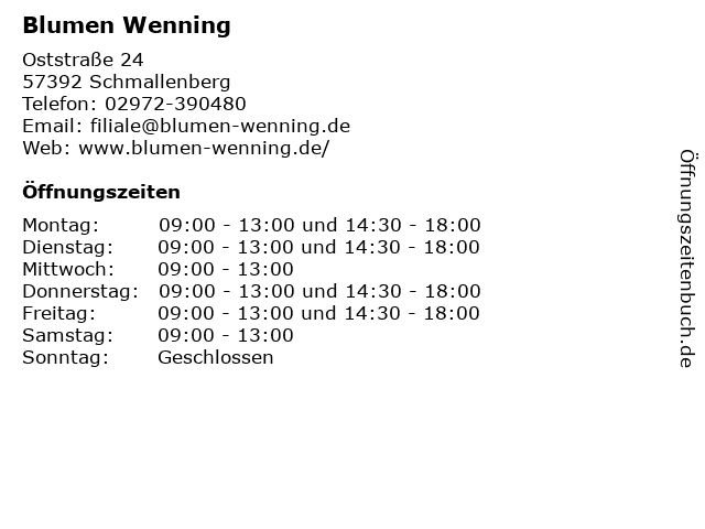 | Öffnungszeiten Blumen Wenning in Schmallenberg anzeigen | |