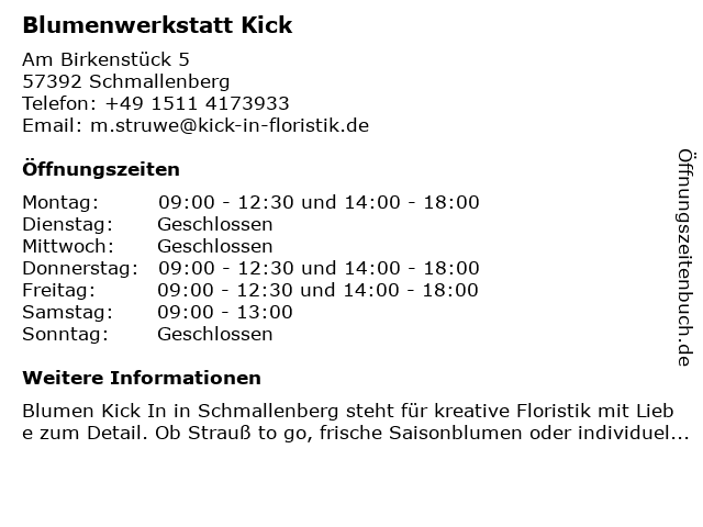 | Öffnungszeiten Blumenwerkstatt Kick in Schmallenberg anzeigen | |