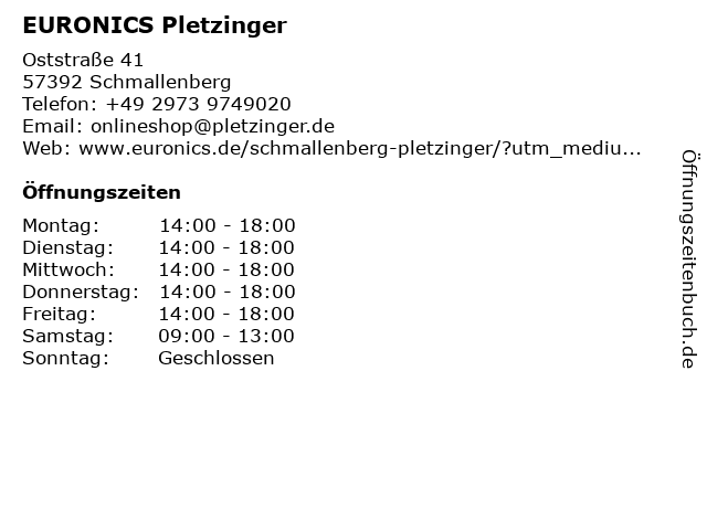 | Öffnungszeiten EURONICS Pletzinger in Schmallenberg anzeigen | |