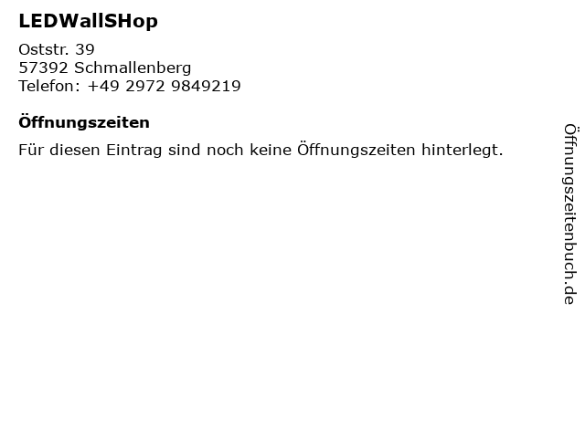 | Öffnungszeiten LEDWallSHop in Schmallenberg anzeigen | |
