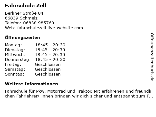 | Öffnungszeiten Fahrschule Zell in Schmelz anzeigen | |