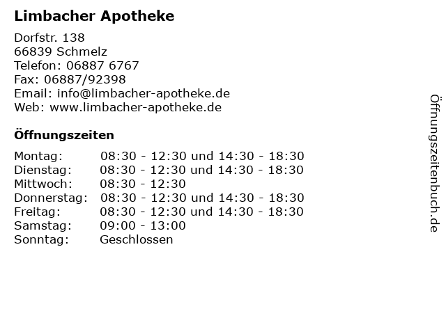 | Öffnungszeiten Limbacher Apotheke in Schmelz anzeigen | |