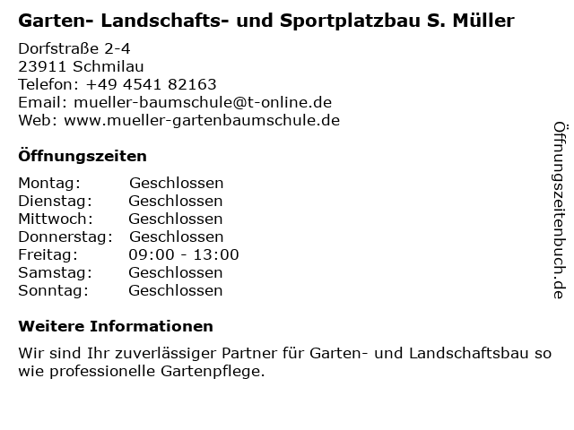 1 Ulrich Noack Garten- und Landschafts- bau (Entfernung: 6,04 km) Kaiser-Friedrich-Str. 4 G, 23879 Mölln 2 Carola Schmidt | Gartenbau | Landschaftsbau (Entfernung: 20,87 km) Brandenbaumer Landstraße 235, 23566 Lübeck 6 Garten- und Grundstückspflege von A-Z Robin Hoffmann (Entfernung: 32,04 km) Klützer Str. 63 b, 23942 Dassow |