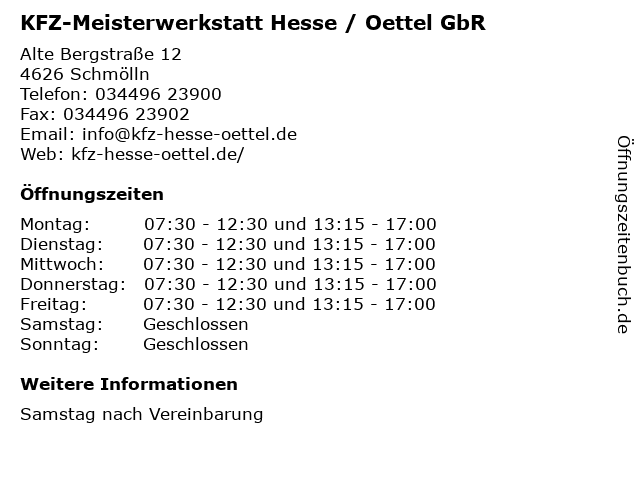 Branchen & Suchbegriffe zu KFZ-Meisterwerkstatt Hesse / Oettel GbR:gbr, hesse, inspektion, karosseriearbeit, kfz, klimaservice, meisterwerkstatt, oettel, reifendienst, reparatur, tüv |