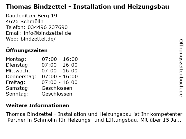 1 Dietmar Seiffarth Sanitär- und Heizungsbau - Bürozeiten (Entfernung: 2,78 km) Dorfstraße 6, 04626 Schmölln 4 Andreas Thoss Elektroinstallation Heizungsbau (Entfernung: 15,70 km) Brauhausstr. 4, 07980 Berga/Elster 5 Dieter Horst Gruschwitz Heizungsbau (Entfernung: 16,29 km) Ronneburger Str. 25 a, 07989 Teichwolframsdorf 6 |