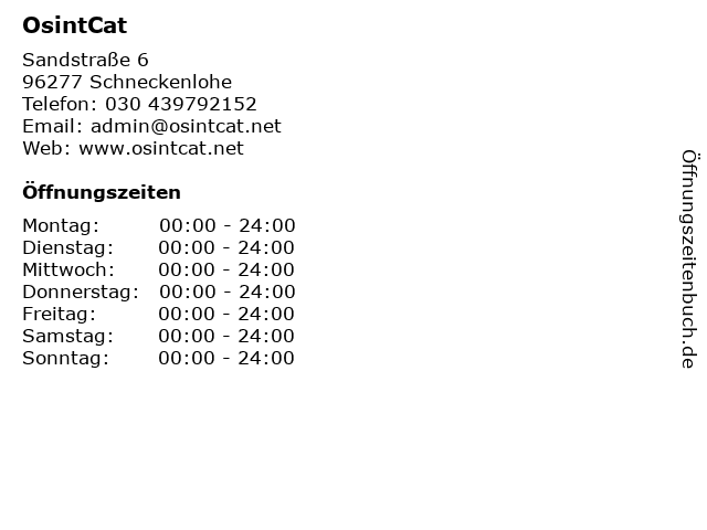 | Öffnungszeiten OsintCat in Schneckenlohe anzeigen | |