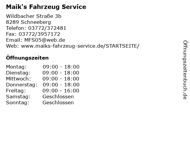 | Öffnungszeiten Maik's Fahrzeug Service in Schneeberg anzeigen | |