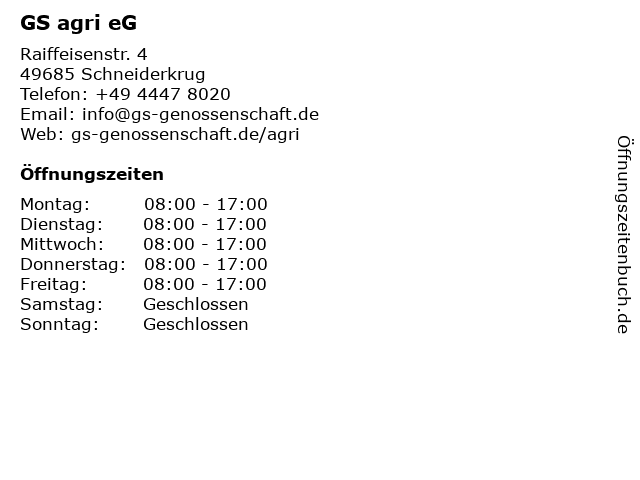 | Öffnungszeiten GS agri eG in Schneiderkrug anzeigen | |