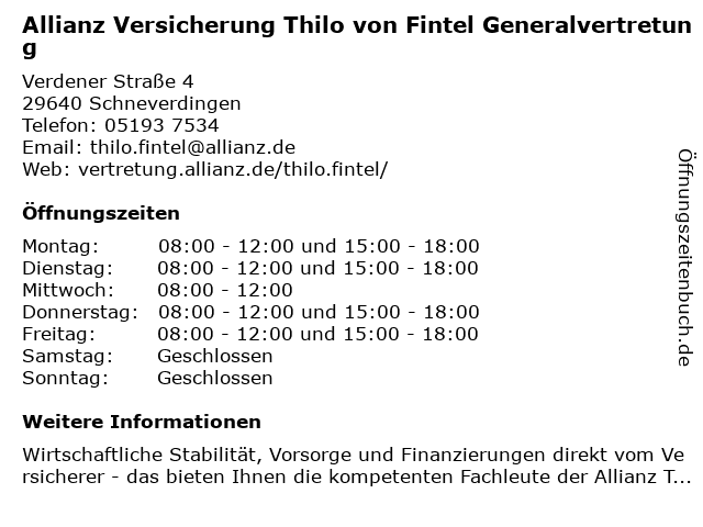 3 Allianz Versicherung Benjamin Ziel Generalvertretung (Entfernung: 0,78 km) Bahnhofstraße 48, 29640 Schneverdingen 4 Fintel Wilhelm von Inh. Wilma Wichert Geflügelzucht (Entfernung: 13,32 km) Birkenweg 26, 27386 Hemslingen 5 Allianz Versicherung Kristina Radloff Generalvertretung (Entfernung: 14,42 km) Bahnhofstraße 3, 29646 Bispingen 6 |