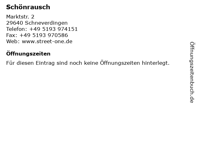| Öffnungszeiten Schönrausch in Schneverdingen anzeigen | |