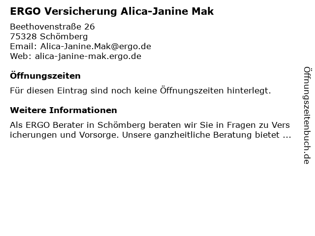 | Öffnungszeiten ERGO Versicherung Alica-Janine Mak in Schömberg anzeigen | |