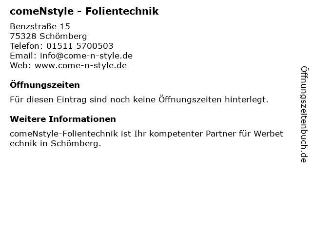| Öffnungszeiten comeNstyle - Folientechnik in Schömberg anzeigen | |