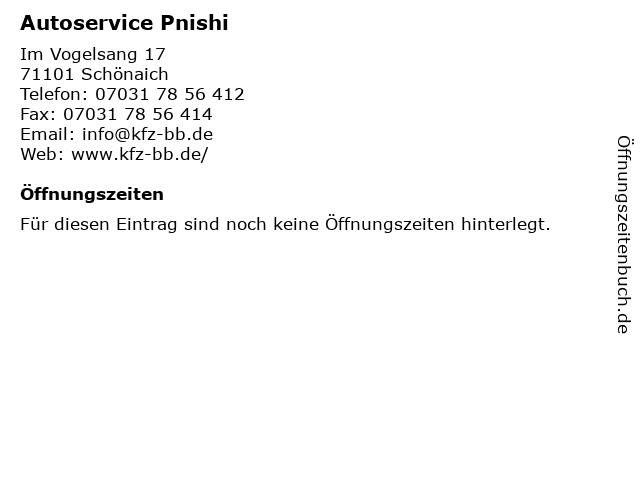 | Öffnungszeiten Autoservice Pnishi in Schönaich anzeigen | |