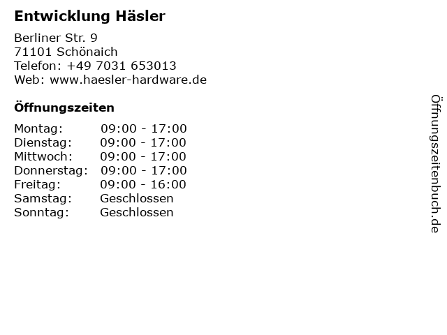 | Öffnungszeiten Entwicklung Häsler in Schönaich anzeigen | |
