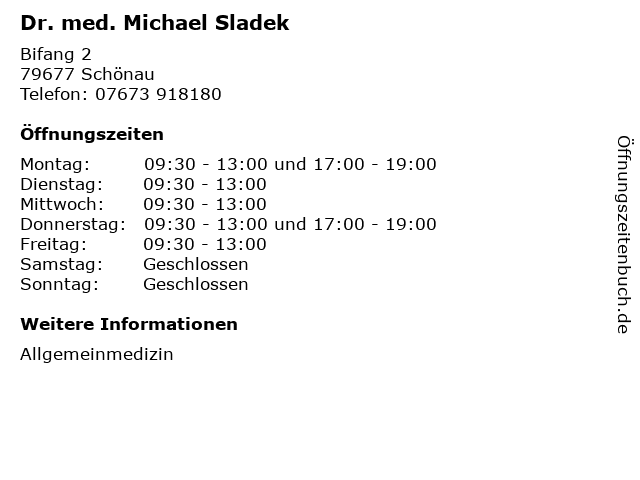 | Öffnungszeiten Dr. med. Michael Sladek in Schönau anzeigen | |
