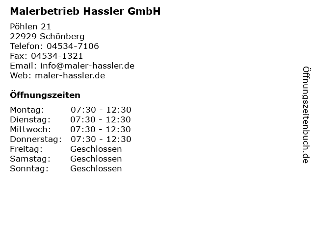 | Öffnungszeiten Malerbetrieb Hassler GmbH in Schönberg anzeigen | |
