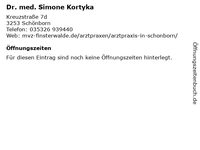 | Öffnungszeiten Dr. med. Simone Kortyka in Schönborn anzeigen | |