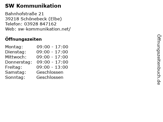 | Öffnungszeiten SW Kommunikation in Schönebeck (Elbe) anzeigen | |