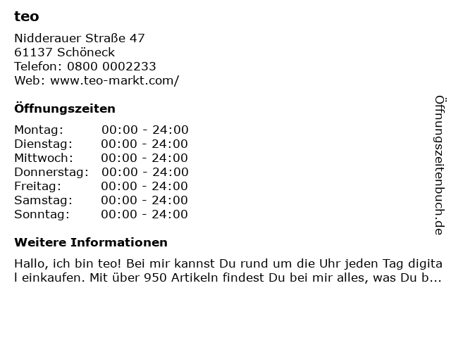 | Öffnungszeiten teo in Schöneck anzeigen | |