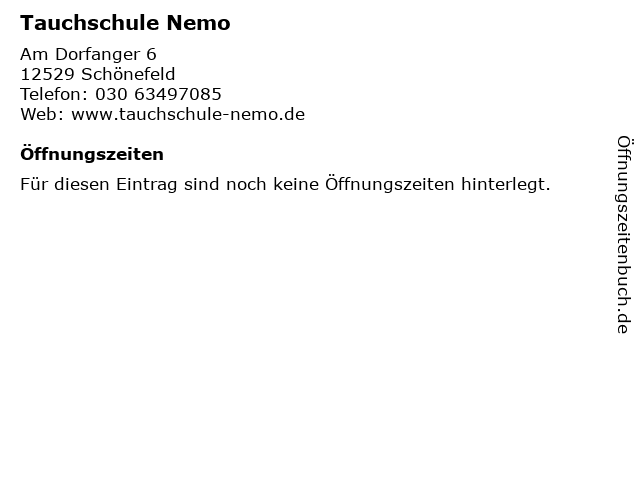 | Öffnungszeiten Tauchschule Nemo in Schönefeld anzeigen | |