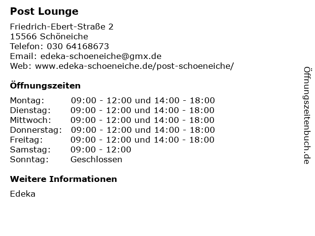 | Öffnungszeiten Post Lounge in Schöneiche anzeigen | |
