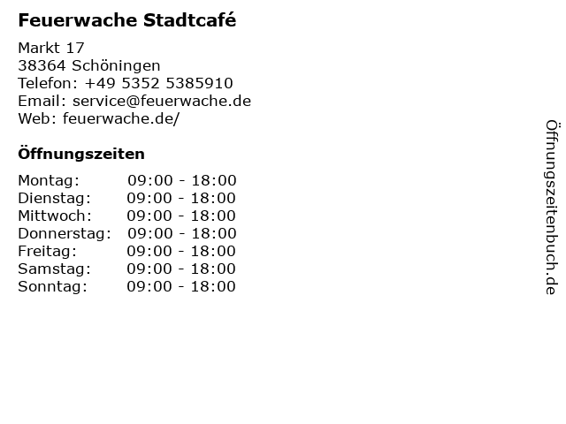 | Öffnungszeiten Feuerwache Stadtcafé in Schöningen anzeigen | |