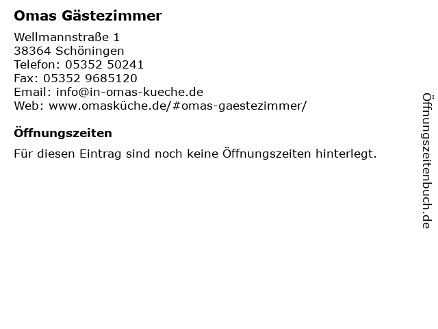 | Öffnungszeiten Omas Gästezimmer in Schöningen anzeigen | |